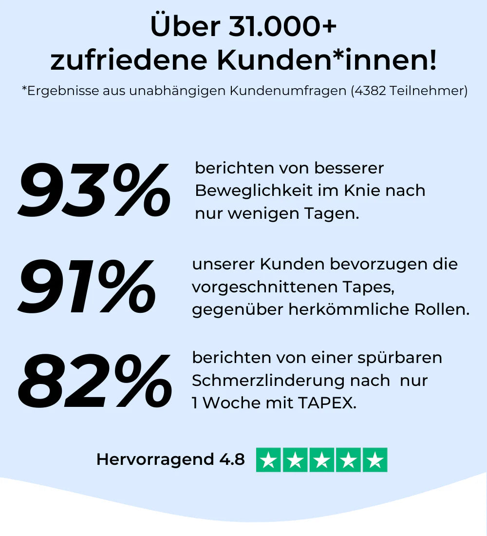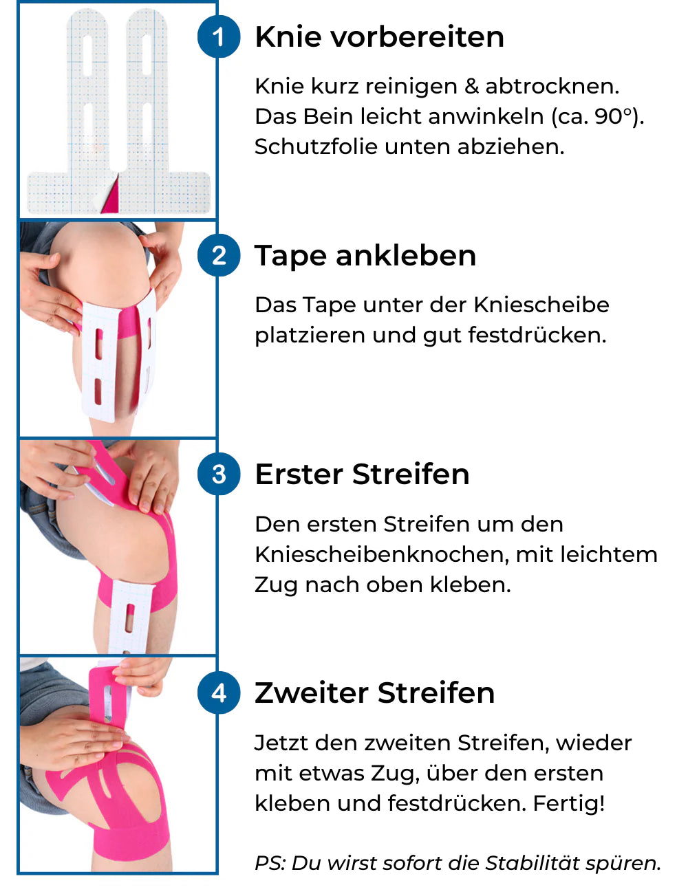 Du musst kein Profi sein, um dein Knie richtig zu tapen: Mit dem vorgeschnittenen Spezialdesign gelingt dir die Anwendung in Sekunden. Kein Zuschneiden, kein Rätseln, kein Risiko von Fehlern – einfach aufkleben und fertig!